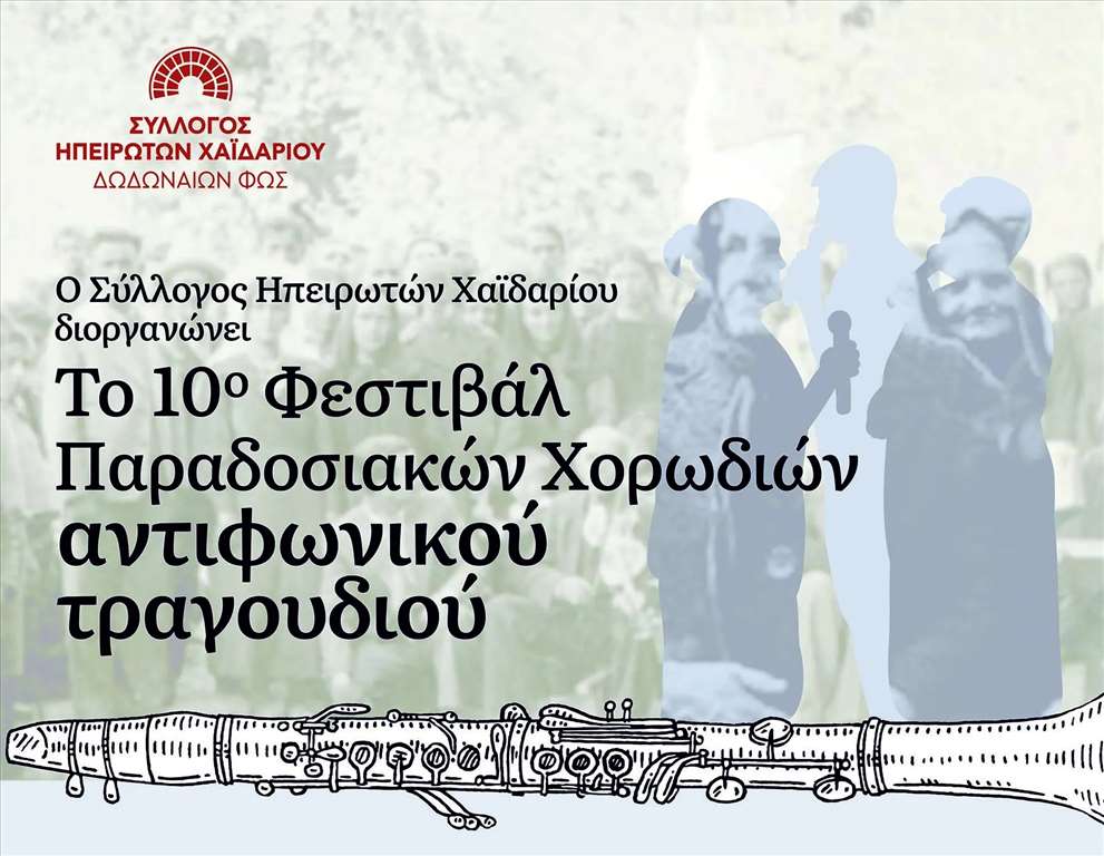 O Σύλλογος Ηπειρωτών Χαϊδαρίου «Δωδωναίων Φως» και ο Δήμος Χαϊδαρίου, σας προσκαλούν στο 10ο φεστιβάλ αντιφωνικού τραγουδιού, την Παρασκευή 14 Φεβρουαρίου 2025 στην αίθουσα εκδηλώσεων του Δημαρχείου Χαϊδαρίου, στις 19:00.
