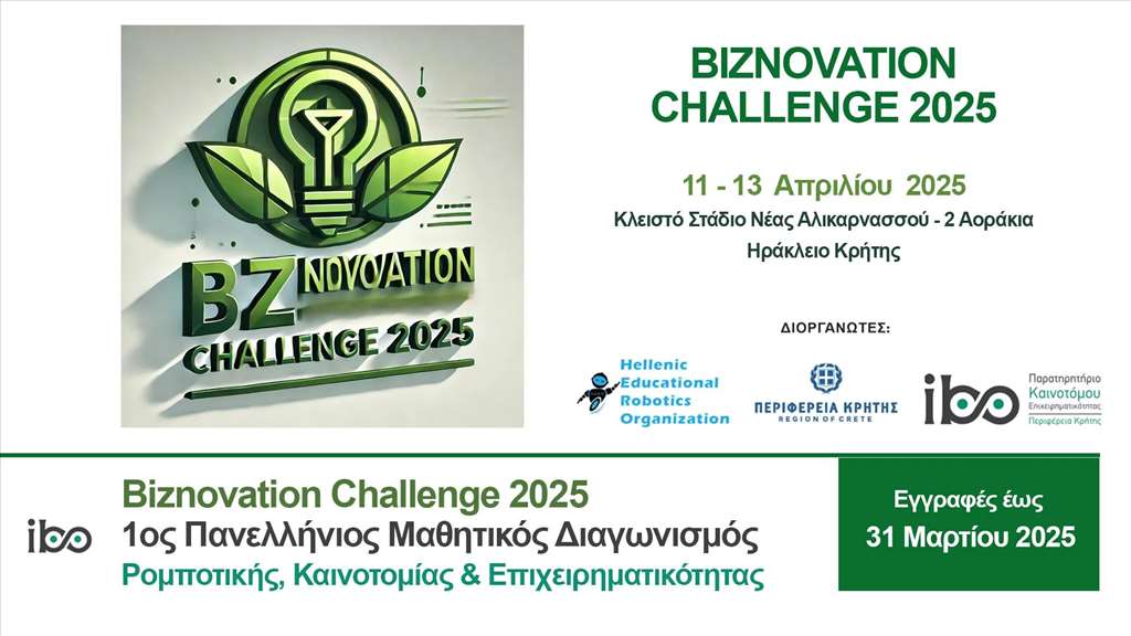 Το Παρατηρητήριο Καινοτόμου Επιχειρηματικότητας Περιφέρειας Κρήτης σε συνεργασία με τον Ελληνικό Οργανισμό Εκπαιδευτικής Ρομποτικής H.E.R.O. , στο πλαίσιο της 4ης Ρομποτικής Ολυμπιάδας MINOAN ROBOTSPORTS COMPETITION GLOBAL OLYMPI-AD 2025 και του έργου “Κρήτη Ευρωπαϊκή Περιφέρεια Γαστρονομίας 2026”, συνδιοργα-νώνουν τον 1ο Πανελλήνιο Μαθητικό Διαγωνισμό Ρομποτικής, Καινοτομίας και Επιχειρη-ματικότητας: Biznovation Challenge (11 – 13 Απριλίου 2025).