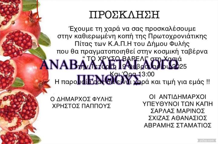 Ο Δήμος Φυλής ανακοινώνει την ΑΝΑΒΟΛΗ ΤΗΣ ΕΚΔΗΛΩΣΗΣ ΓΙΑ ΤΗΝ ΚΟΠΗ ΤΗΣ ΠΡΩΤΟΧΡΟΝΙΑΤΙΚΗΣ ΠΙΤΑΣ ΤΩΝ…