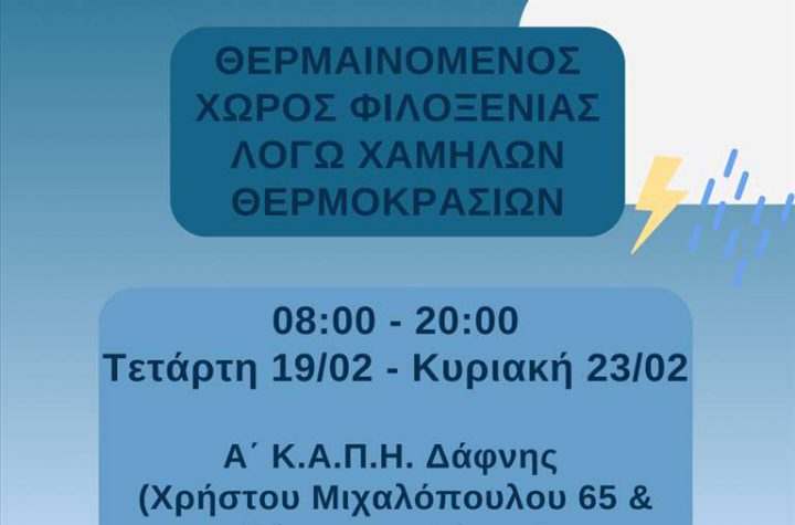 Ο Δήμος Δάφνης-Υμηττού θέτει σε λειτουργία θερμαινόμενο χώρο φιλοξενίας στο Α’ Κ.Α.Π.Η. Δάφνης (Χρήστου Μιχαλόπουλου…