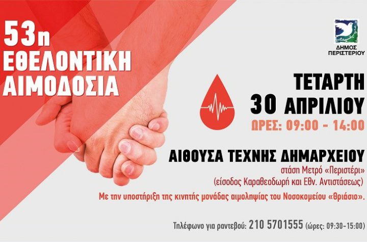 O Δήμος Περιστερίου διοργανώνει την 53η Εθελοντική Αιμοδοσία, με την υποστήριξη της κινητής μονάδας αιμοληψίας…