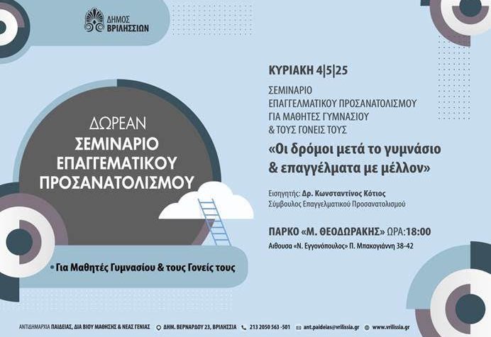 Δωρεάν σεμινάριο επαγγελματικού προσανατολισμού διοργανώνει η Αντιδημαρχία Παιδείας του Δήμου Βριλησσίων με εισηγητή τον Δρ….