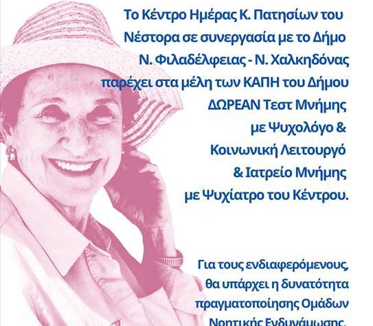 Ο Δήμος Νέας Φιλαδέλφειας-Νέας Χαλκηδόνας, σε συνεργασία με την ψυχογηριατρική εταιρεία «ΝΕΣΤΩΡ» παρέχει στα μέλη…