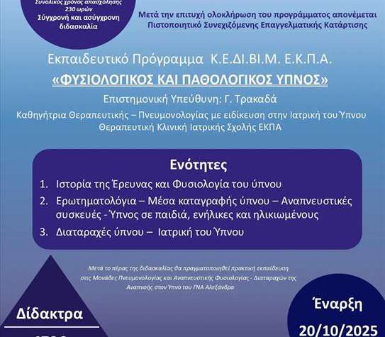 Το πρόγραμμα θα διεξαχθεί δια ζώσης και εξ αποστάσεως. Αρχίζει στις 20 Οκτωβρίου. Θα διαρκέσει…