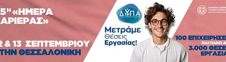 Η Δημόσια Υπηρεσία Απασχόλησης (ΔΥΠΑ) διοργανώνει τη 45η εκδήλωση «Ημέρες Καριέρας» στη Θεσσαλονίκη, την Παρασκευή…