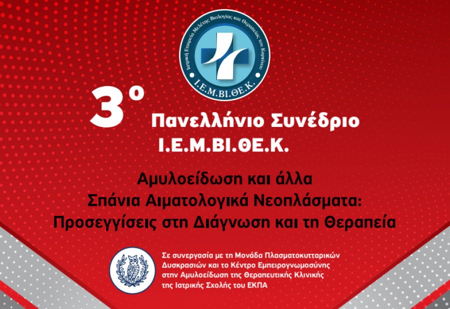 Το 3ο Πανελλήνιο Συνέδριου διοργανώνει η Ιατρική Εταιρεία Μελέτης της Βιολογίας και Θεραπείας του Καρκίνου (Ι.Ε.Μ.ΒΙ.ΘΕ.Κ) σε συνεργασία με τη Μονάδα Πλασματοκυτταρικών ∆υσκρασιών και το Κέντρο Εμπειρογνωμοσύνης στην Αμυλοείδωση της Θεραπευτικής Κλινικής της Ιατρικής Σχολής του ΕΚΠΑ όπου θα πραγματοποιηθεί στις 21, 22 και 23 Φεβρουαρίου, στο ξενοδοχείο Divani Caravel, με θέμα: "Αμυλοείδωση και άλλα Σπάνια Αιματολογικά Νεοπλάσματα: Προσεγγίσεις στη Διάγνωση και τη Θεραπεία".