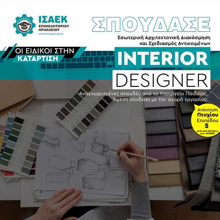 Οι Τεχνικές Σχολές Επιμελητηρίου Ηρακλείου προσκαλούν κάθε ενδιαφερόμενο για μια σύντομη, ΔΩΡΕΑΝ, παρουσίαση και ξενάγηση στα εργαστήρια και το πρόγραμμα σπουδών του Τμήματος Εσωτερικής Αρχιτεκτονικής, Διακόσμησης & Σχεδιασμού Αντικειμένων (Interior Design) της ΙΣΑΕΚ Επιμελητηρίου Ηρακλείου.