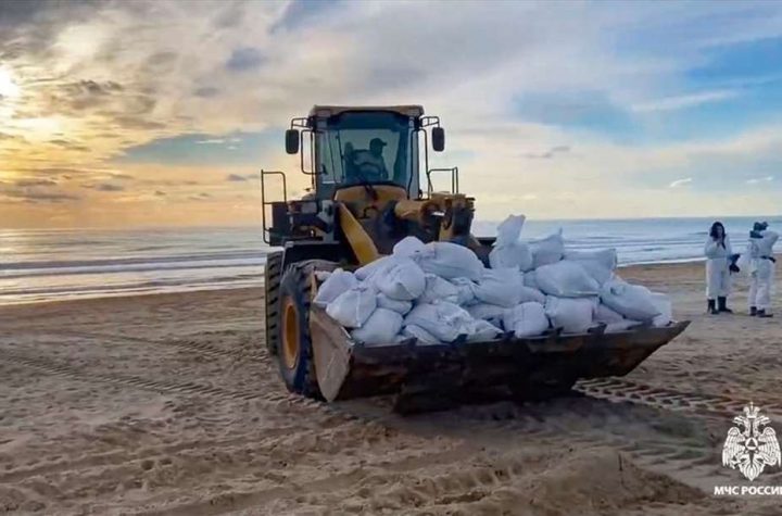 Οι εργαζόμενοι στις υπηρεσίες εκτάκτων αναγκών που συμμετέχουν στον καθαρισμό της πετρελαιοκηλίδας στη Μαύρη Θάλασσα…