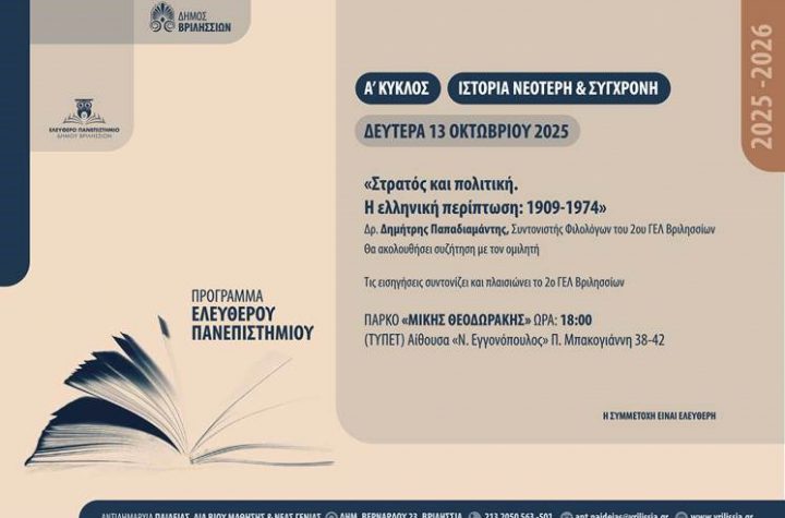 Το Ελεύθερο Πανεπιστήμιο του Δήμου Βριλησσίων ξεκινά το νέο κύκλο συναντήσεων τη Δευτέρα 13/10/2025 και…