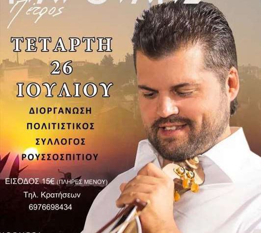 Πανηγύρι στο Ρουσσοσπίτι Ρεθύμνου με τον Πέτρο Μαρούλη, στο χώρο του Πολιτιστικού Συλλόγου Ρουσσοσπιτίου. Είσοδος…