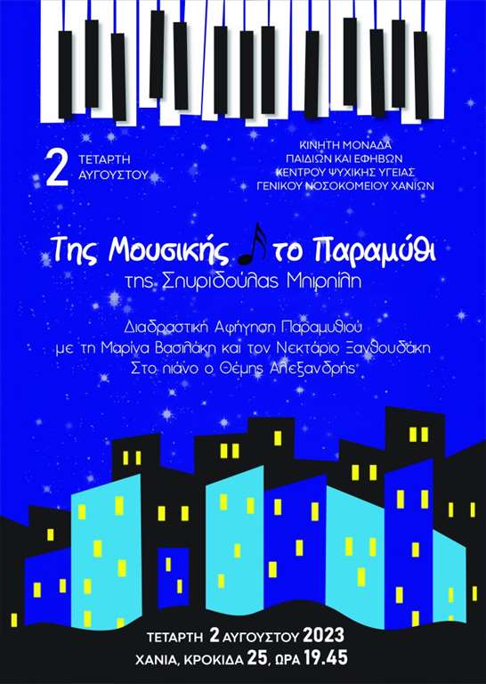 Η Κινητή μονάδα Παιδιών και Εφήβων του Κέντρου Ψυχικής Υγείας του Γενικού Νοσοκομείου Χανίων διοργανώνει παιδική εκδήλωση στον υπαίθριο χώρο του, στην Κροκιδά 25 την Τετάρτη 2/8/2023 και ώρα 19:45 το απόγευμα.