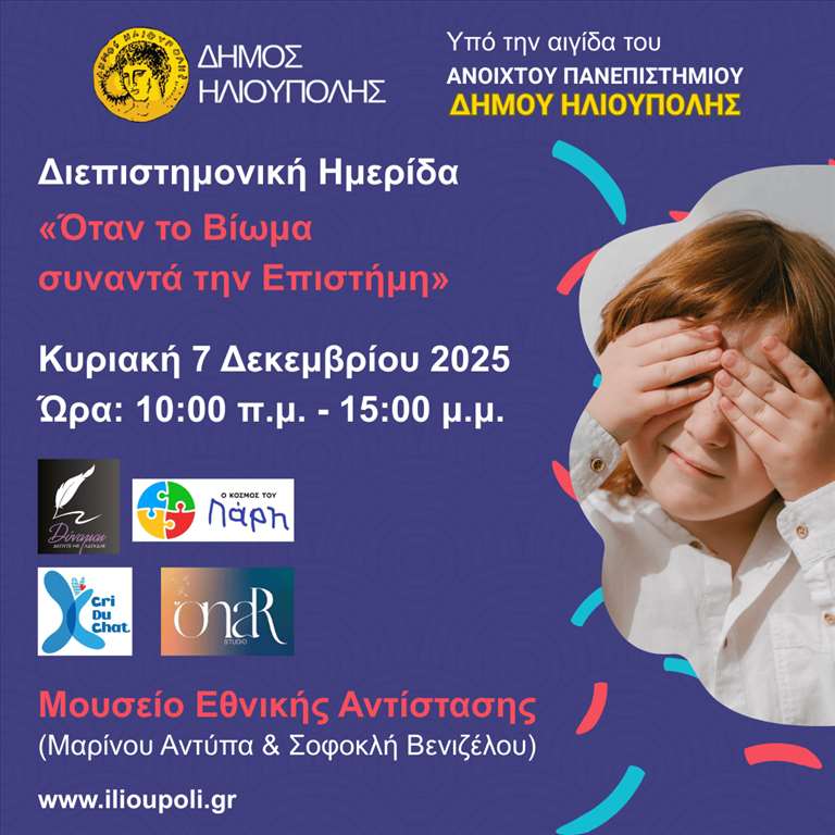 Οι φορείς "Δύναμαι, άκουσέ με", "Ο Κόσμος του Πάρη", “Cri du chat Greece" και Onar studio, με την υποστήριξη του Δήμου Ηλιούπολης και υπό την αιγίδα του ΑΝΟΙΧΤΟΥ ΠΑΝΕΠΙΣΤΗΜΙΟΥ ΔΗΜΟΥ ΗΛΙΟΥΠΟΛΗΣ σας προσκαλούν στη