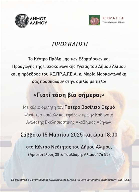 Ο Δήμος Αλίμου και το Κέντρο Πρόληψης των Εξαρτήσεων και Προαγωγής της Ψυχοκοινωνικής Υγείας σας προσκαλούν σε μια σημαντική ομιλία με θέμα «Γιατί τόση βία σήμερα;», το Σάββατο 15 Μαρτίου 2025 και ώρα 18:00, στο Κέντρο Νεότητας του Δήμου Αλίμου (Αριστοτέλους 39 & Τσαλδάρη, Άλιμος).