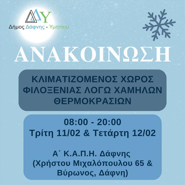 Ο Δήμος Δάφνης-Υμηττού θέτει σε λειτουργία θερμαινόμενο χώρο φιλοξενίας στο Α’ Κ.Α.Π.Η. Δάφνης (Χρήστου Μιχαλόπουλου 65 & Βύρωνος, Δάφνη), την Τρίτη 11.02 και την Τετάρτη 12.02 και ώρες 08:00 – 20:00, προκειμένου να προστατεύσει και να παρέχει στέγη σε άστεγους συμπολίτες μας, καθώς και σε όσους έχουν άμεση ανάγκη, λόγω των χαμηλών θερμοκρασιών.
