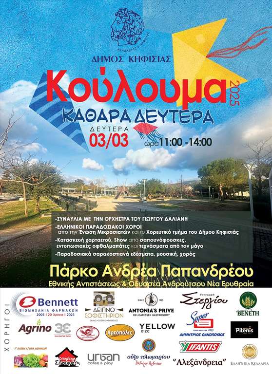 Για άλλη μια χρονιά ο Δήμος Κηφισιάς γιορτάζει τα "Κούλουμα" με παραδοσιακό γλέντι, σαρακοστιανά εδέσματα και εκπλήξεις για τα παιδιά την Καθαρά Δευτέρα, 3 Μαρτίου από τις 11-14.00 στο Πάρκο "Ανδρέα Παπανδρέου" (Εθνικής Αντιστάσεως & Οδυσσέα Ανδρούτσου), στη Νέα Ερυθραία.
