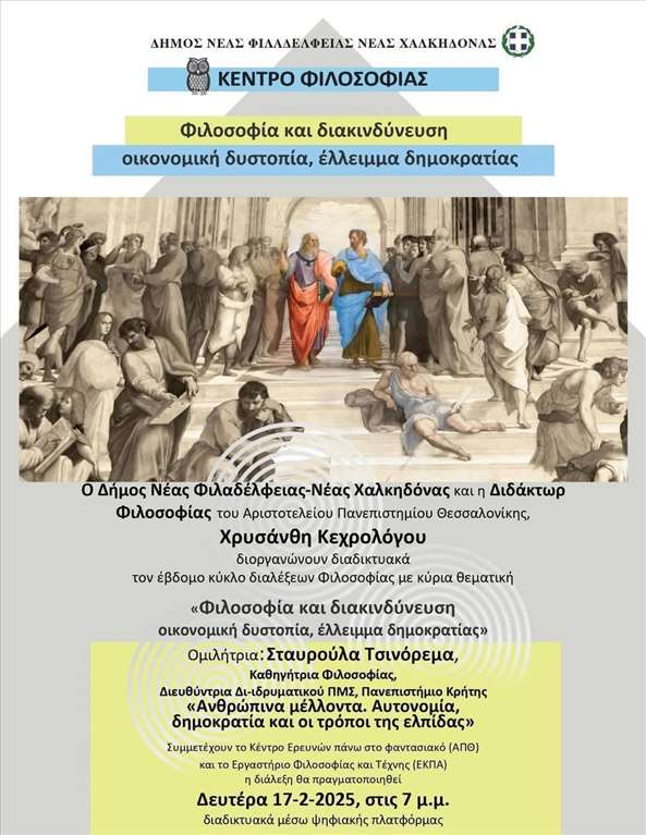 Ο Δήμος Νέας Φιλαδέλφειας – Νέας Χαλκηδόνας και η Διδάκτωρ Φιλοσοφίας του Αριστοτελείου Πανεπιστημίου Θεσσαλονίκης, Χρυσάνθη Κεχρολόγου, συνεχίζουν με επιτυχία για έβδομο έτος, νέο κύκλο διαλέξεων με κυρία θεματική: «Φιλοσοφία και Διακινδύνευση οικονομική δυστοπία, έλλειμμα δημοκρατίας»