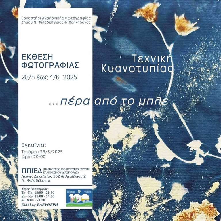 Την Τετάρτη 28 Μαΐου και ώρα 20:00, στο Παγκόσμιο Πολιτιστικό Ίδρυμα Ελληνισμού Διασποράς (ΠΠΙΕΔ)-Μουσείο Μικρασιατικού Ελληνισμού "Φιλιώ Χαϊδεμένου", εγκαινιάζεται η έκθεση φωτογραφίας με τίτλο : …πέρα από το μπλε, που διοργανώνει το εργαστήρι Αναλογικής Φωτογραφίας του Τμήματος Πολιτισμού του Δήμου Νέας Φιλαδέλφειας – Νέας Χαλκηδόνας.