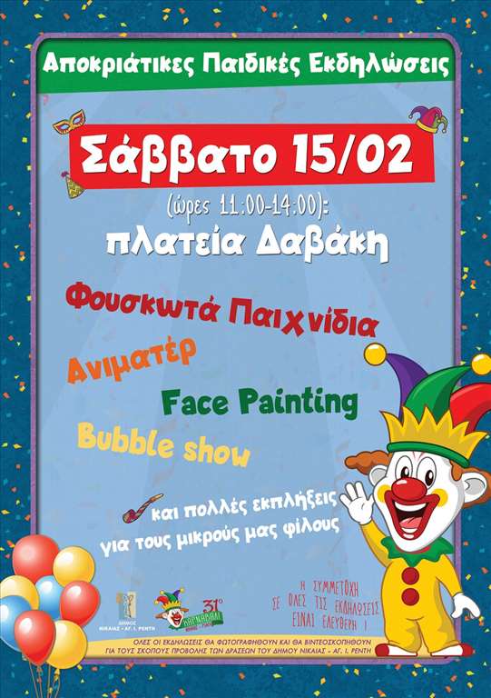 Αποκριάτικες εκδηλώσεις στις πλατείες της πόλης διοργανώνει ο Δήμος Νίκαιας-Αγ.Ι. Ρέντη στο πλαίσιο του 31ου Καρναβαλιού. Το Σάββατο 15 Φεβρουαρίου η πλατεία Δαβάκη θα περιμένει τους μικρούς της φίλους με μπαλονοκατασκευές, διαγωνισμούς και Face painting. Η κλόουν Σφυριχτρούλα υπόσχεται πολλές εκπλήξεις και ο μοναδικός Magician Filipino είναι αποφασισμένος να μας αφήσει στην κυριολεξία με το στόμα ανοιχτό! Ακόμη τα παιδιά θα έχουν την ευκαιρία να απολαύσουν ένα φαντασμαγορικό Bubble Show και να χαρούν με φουσκωτά πολυμορφικά παιχνίδια.