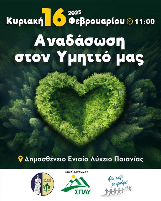 Ο Δήμος Παιανίας σε συνεργασία με τον ΣΠΑΥ και το Όλοι μαζί Μπορούμε, διοργανώνει μεγάλη δράση αναδάσωσης, αυτή την Κυριακή 16/02/2025 στον Υμηττό.