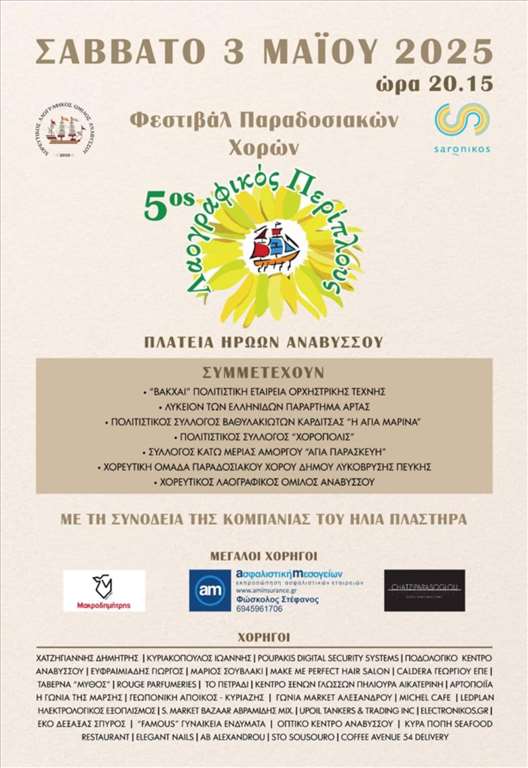 Παραδοσιακοί χοροί και τραγούδια, αυθεντικές φορεσιές και μια καταξιωμένη μουσική κομπανία συνθέτουν τον 5ο Λαογραφικό Περίπλου, το Φεστιβάλ Παραδοσιακών Χορών που διοργανώνει ο Δήμος Σαρωνικού και ο Χορευτικός Όμιλος Αναβύσσου.