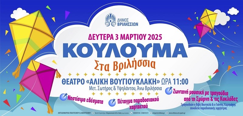 Την Καθαρά Δευτέρα 3 Μαρτίου 2025 όλοι μαζί, γιορτάζουμε τα Κούλουμα στο ανοιχτό θέατρο «Αλίκη Βουγιουκλάκη» Μεταμορφώσεως του Σωτήρος και Υψηλάντου στα Άνω Βριλήσσια.