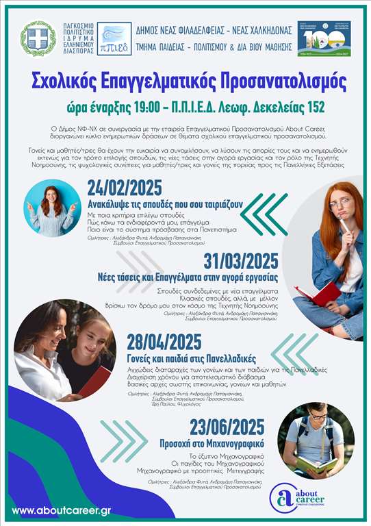Ο Δήμος Νέας Φιλαδέλφειας-Νέας Χαλκηδόνας, σε συνεργασία με την εταιρεία Επαγγελματικού Προσανατολισμού About Career, διοργανώνει έναν κύκλο δωρεάν ενημερωτικών παρουσιάσεων, με σκοπό να βοηθήσει μαθητές/τριες και γονείς να κατανοήσουν και να γνωρίσουν τον τρόπο που θα επιλέξουν τη μελλοντική επαγγελματική τους πορεία, μέσα σε έναν κόσμο που διαρκώς αλλάζει.