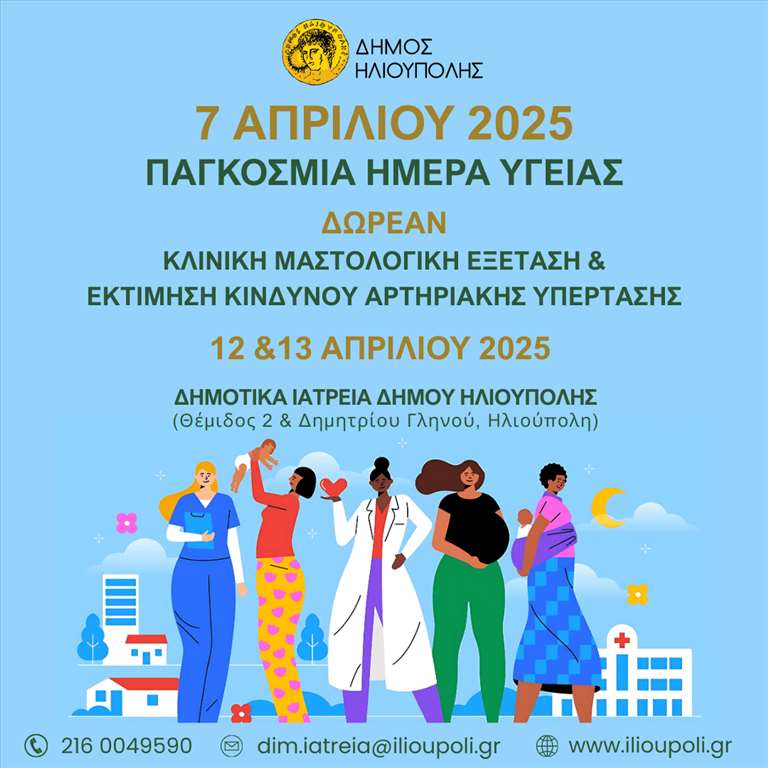 Ο Δήμος Ηλιούπολης με αφορμή την Παγκόσμια Ημέρα Υγείας, που εορτάζεται κάθε χρόνο στις 7 Απριλίου 2025, προσκαλεί τις γυναίκες που το επιθυμούν το Σάββατο 12 Απριλίου και την Κυριακή 13 Απριλίου 2025, να πραγματοποιήσουν Δωρεάν Κλινική Μαστολογική Εξέταση από τις 10:00 π.μ. έως τις 13:30 μ.μ. στα Δημοτικά Ιατρεία του Δήμου Ηλιούπολης (Θέμιδος 2 και Δημητρίου Γληνού).