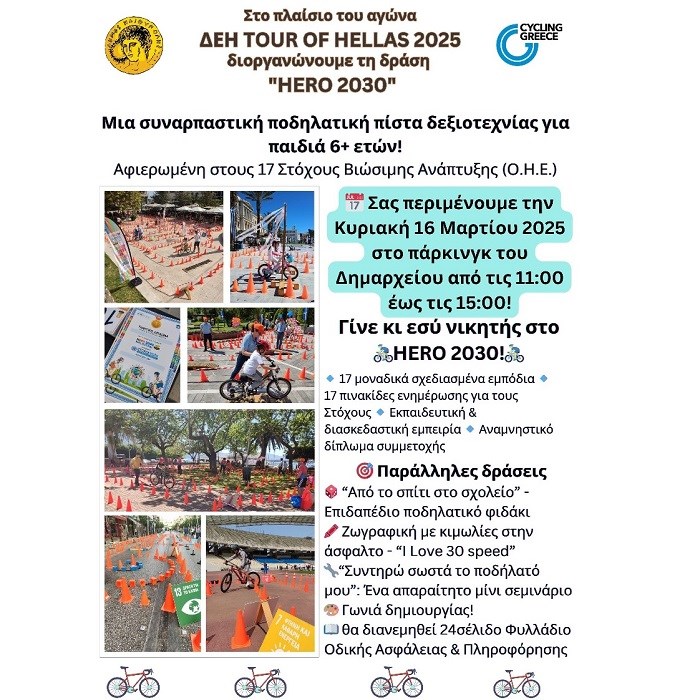 Ο Δήμος Ηλιούπολης, σε συνεργασία με την Cycling Greece, διοργανώνει τη δράση "HERO 2030" στο πλαίσιο του ΔΕΗ TOUR OF HELLAS 2025. Πρόκειται για μια συναρπαστική ποδηλατική πίστα δεξιοτεχνίας, ειδικά σχεδιασμένη για παιδιά ηλικίας 6 ετών και άνω, με στόχο την εκπαίδευση και την ευαισθητοποίησή τους γύρω από την οδική ασφάλεια και τη βιώσιμη ανάπτυξη. Η εκδήλωση είναι αφιερωμένη στους 17 Στόχους Βιώσιμης Ανάπτυξης του ΟΗΕ, προωθώντας τη σημασία της οικολογικής μετακίνησης και της υπεύθυνης συμπεριφοράς στους δρόμους.