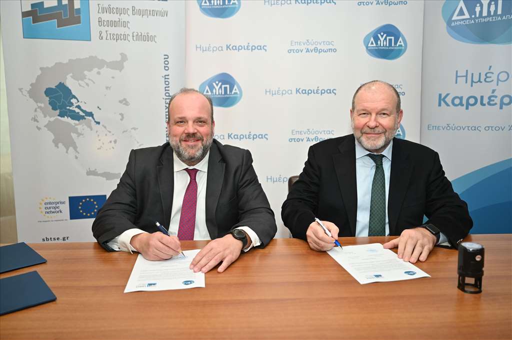 Μνημόνιο συνεργασίας υπέγραψαν σήμερα ο Διοικητής της Δημόσιας Υπηρεσίας Απασχόλησης (ΔΥΠΑ), Σπύρος Πρωτοψάλτης και ο Πρόεδρος Διοικητικού Συμβουλίου και Εκτελεστικής Επιτροπής του Συνδέσμου Βιομηχανιών Θεσσαλίας και Στερεάς Ελλάδας (ΣΒΘΣΕ), Αθανάσιος Συριανός, στο πλαίσιο της Ημέρας Καριέρας που πραγματοποιήθηκε στο Βόλο.
