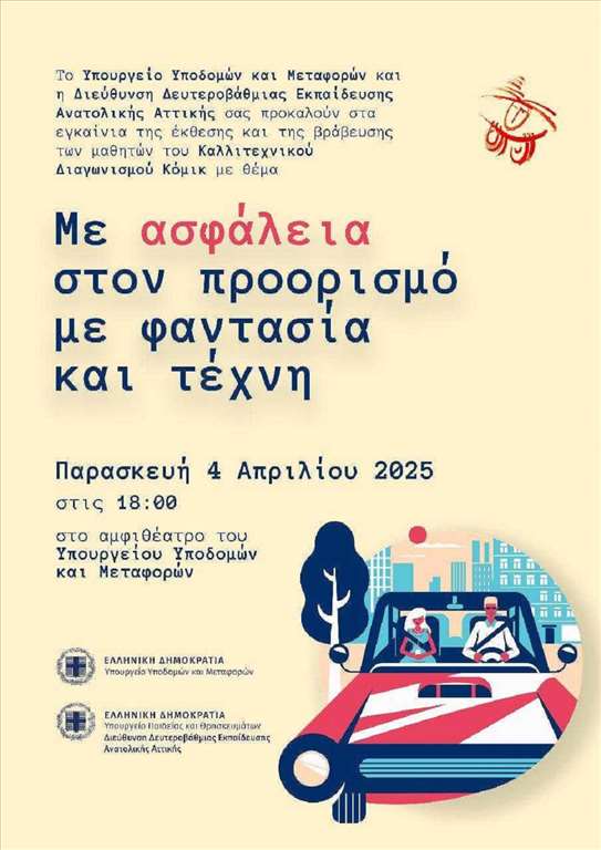 Το Υπουργείο Υποδομών και Μεταφορών και η Διεύθυνση Δευτεροβάθμιας Εκπαίδευσης Ανατολικής Αττικής διοργανώνουν, την Παρασκευή 4 Απριλίου 2025 και ώρα 18:00, τα εγκαίνια της έκθεσης και την τελετή βράβευσης του Καλλιτεχνικού Διαγωνισμού Κόμικ, με θέμα: «Με ασφάλεια στον προορισμό – με φαντασία και τέχνη».