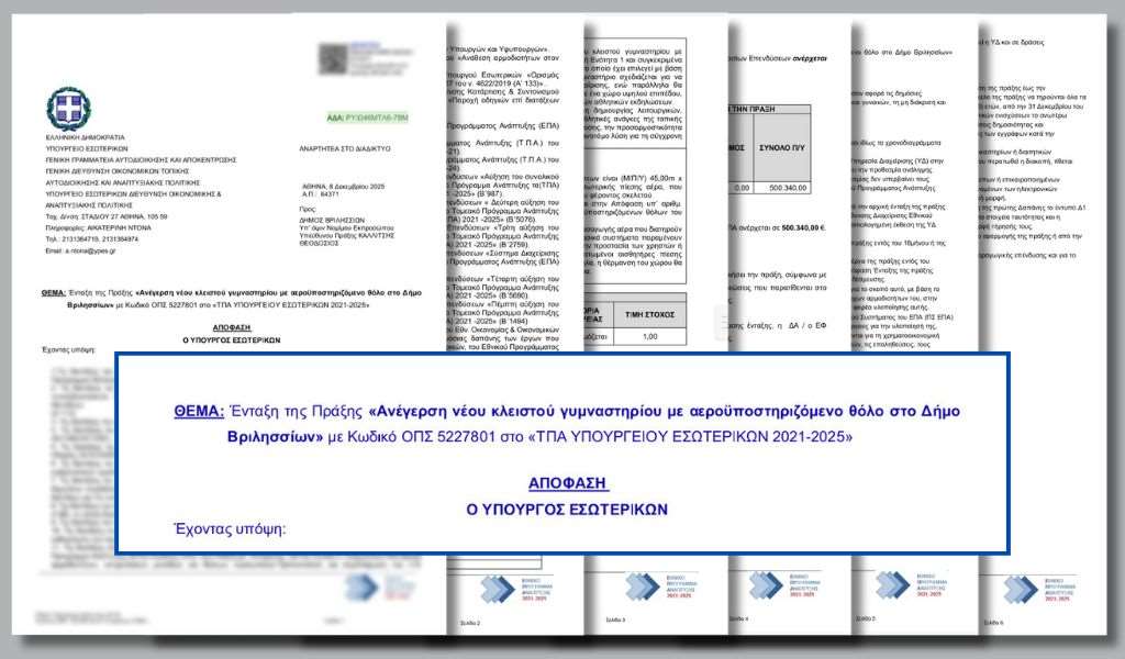 Με ένα ευχάριστο νέο ξεκινά το 2026 για τα Βριλήσσια, καθώς μπαίνει σε τροχιά υλοποίησης ένα εμβληματικό έργο για τον εκσυγχρονισμό των αθλητικών υποδομών στα Βριλήσσια, μετά την οριστική έγκριση χρηματοδότησης ύψους 500.340 ευρώ από το Eθνικό Πρόγραμμα Ανάπτυξης για την ανέγερση νέου κλειστού γυμναστηρίου με αεροϋποστηριζόμενο θόλο (μπαλόνι).
