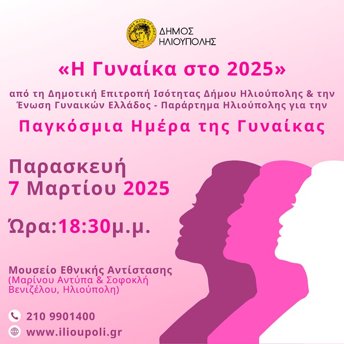 Η Δημοτική Επιτροπή Ισότητας του Δήμου Ηλιούπολης και η Ένωση Γυναικών Ελλάδος – Παράρτημα Ηλιούπολης έχουν την τιμή να σας προσκαλέσουν σε μία εκδήλωση για την Παγκόσμια Ημέρα της Γυναίκας την Παρασκευή 7 Μαρτίου 2025 και ώρα 18:30 μ.μ., στο Μουσείο Εθνικής Αντίστασης (Μαρίνου Αντύπα και Σοφοκλή Βενιζέλου, Ηλιούπολη), με τίτλο «H Γυναίκα στο 2025».