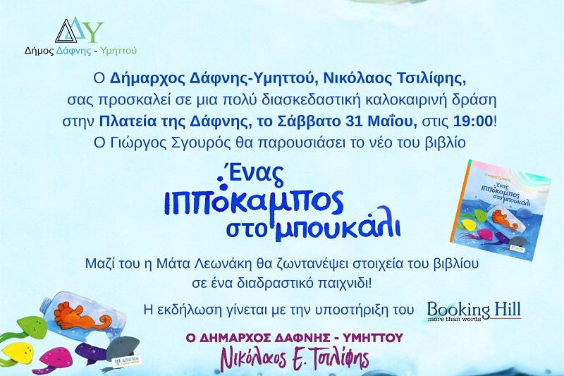 Ο Δήμαρχος Δάφνης-Υμηττού, Νικόλαος Τσιλίφης, σας προσκαλεί σε μια καλοκαιρινή και πολύχρωμη γιορτή με αφορμή την παρουσίαση του παραμυθιού του Γιώργου Σγουρού, «Ένας ιππόκαμπος στο μπουκάλι».
