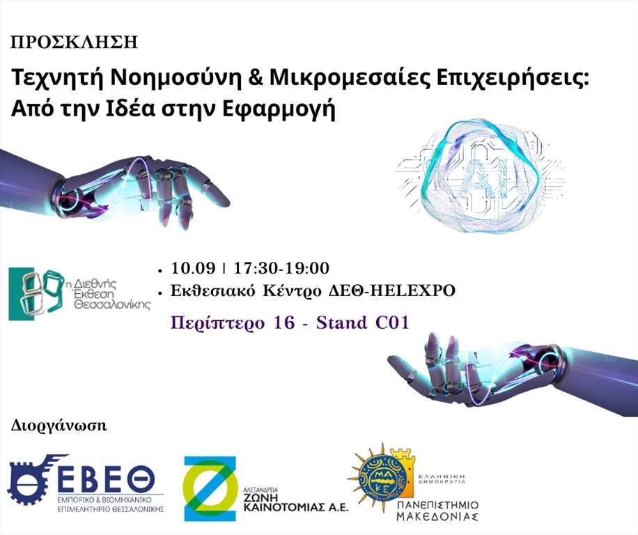Το Εμπορικό και Βιομηχανικό Επιμελητήριο Θεσσαλονίκης, η Αλεξάνδρεια Ζώνη Καινοτομίας και το ΔΠΜΣ στη Διοίκηση Επιχειρήσεων του Πανεπιστημίου Μακεδονίας πραγματοποιούν εσπερίδα με θέμα: «Τεχνητή Νοημοσύνη & Μικρομεσαίες Επιχειρήσεις: Από την Ιδέα στην Εφαρμογή».