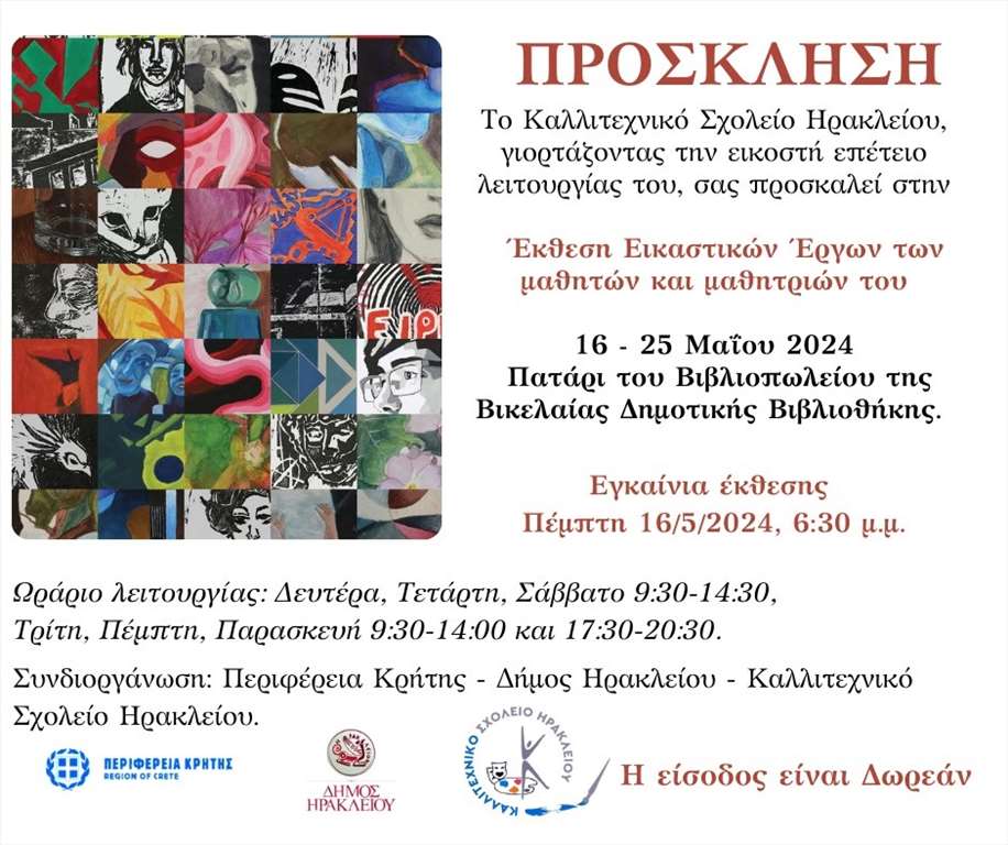 Το Καλλιτεχνικό Σχολείο Ηρακλείου, γιορτάζοντας τα 20 χρόνια λειτουργίας του, διοργανώνει, μεταξύ άλλων, την ετήσια έκθεση έργων των μαθητών και μαθητριών του από τα εργαστήρια των Εικαστικών, στο πατάρι του βιβλιοπωλείου της Βικελαίας Δημοτικής Βιβλιοθήκης. Η έκθεση, που συνδιοργανώνεται από την Περιφέρεια Κρήτης και το Δήμο Ηρακλείου, θα διαρκέσει από 16 ως 25 Μαΐου και η είσοδος για το κοινό είναι ελεύθερη. Τα εγκαίνια της έκθεσης θα γίνουν την Πέμπτη 16 Μαΐου και ώρα 6:30μ.μ. Το ωράριο λειτουργίας της έκθεσης είναι: Δευτέρα Τετάρτη και Σάββατο 9:30-14:30, Τρίτη, Πέμπτη και Παρασκευή 9:30-14:00 και 17:30-20:30.
