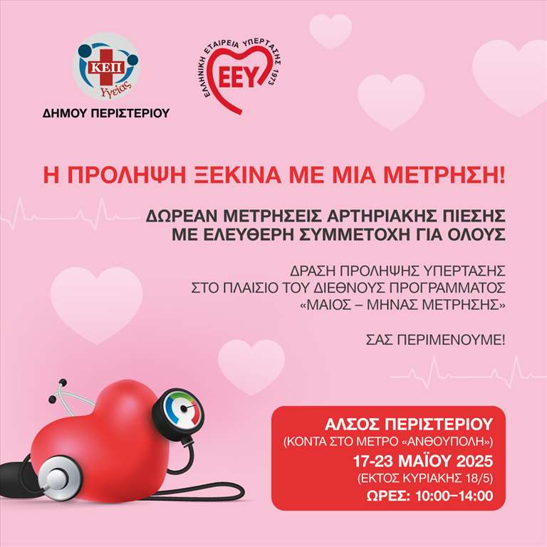 Το ΚΕΠ Υγείας του Δήμου Περιστερίου, σε συνεργασία με την Ελληνική Εταιρεία Υπέρτασης, συμμετέχει και φέτος δυναμικά στην παγκόσμια εκστρατεία ενημέρωσης και πρόληψης «Μάιος – Μήνας Μέτρησης» της Διεθνούς Εταιρείας Υπέρτασης, με αφορμή την Παγκόσμια Ημέρα Υπέρτασης (17 Μαΐου).