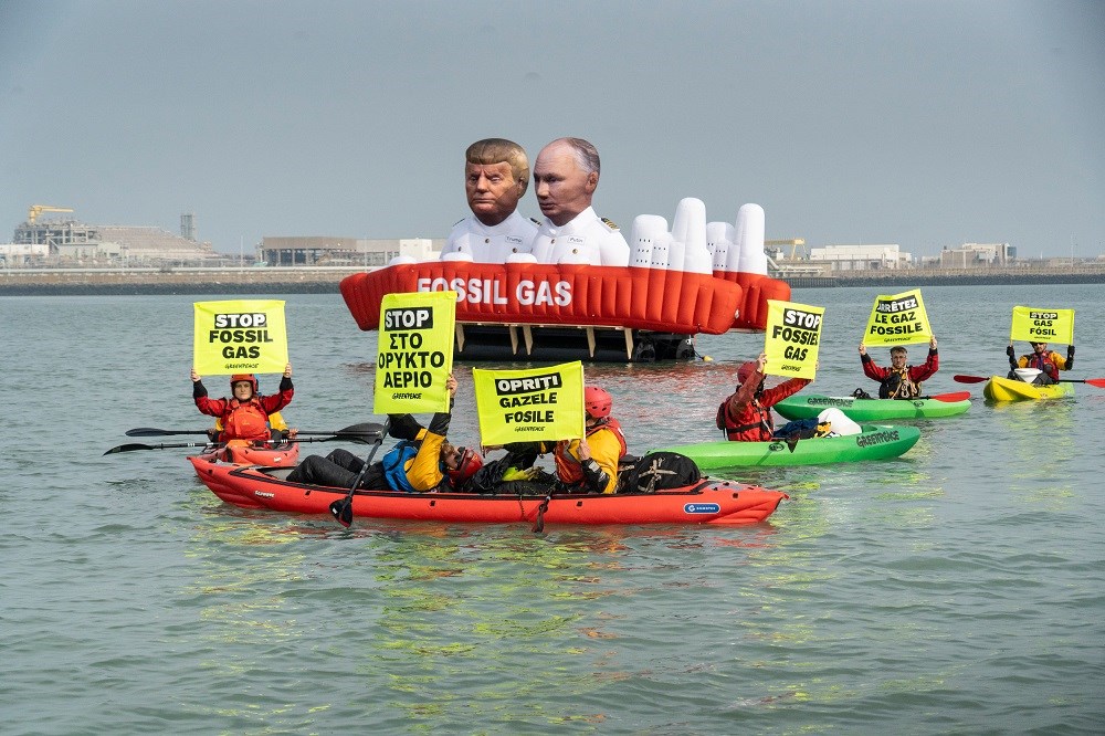 55 ακτιβιστές του βελγικού γραφείου της Greenpeace από 15 χώρες, ανάμεσά τους και ακτιβιστές από την Ελλάδα, μπλοκαραν εχθες τον τερματικό σταθμό υγροποιημένου αερίου Zeebrugge, και παραμένουν εκεί σε ένδειξη διαμαρτυρίας για την εξάρτηση της Ευρώπης από τις εισαγωγές αερίου από τις ΗΠΑ και τη Ρωσία. Ενώ η ΕΕ συζητά νέες κυρώσεις κατά της Ρωσίας και ο Τραμπ συνεχίζει να πιέζει την ΕΕ να αγοράσει περισσότερο αέριο από τις ΗΠΑ, η Greenpeace καλεί τους ηγέτες της ΕΕ να μειώσουν την εξάρτηση από τα ορυκτά καύσιμα, καταργώντας σταδιακά το αέριο και επιταχύνοντας τη μετάβαση στις ανανεώσιμες πηγές ενέργειας.