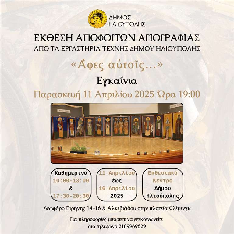 Με αφορμή την αναμονή του θείου δράματος, το εργαστήρι Αγιογραφίας του Δήμου Ηλιούπολης, εγκαινιάζει την Ομαδική Έκθεση Αποφοίτων με τίτλο «Ἄφες αὐτοῖς…», την Παρασκευή 11 Απριλίου 2025, στις 19:00 μ.μ., στο Εκθεσιακό Κέντρο Ηλιούπολης.