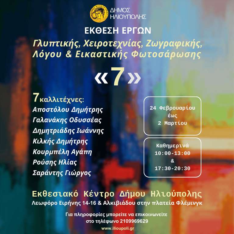 7 καλλιτέχνες ενώνουν τις δυνάμεις τους και διοργανώνουν την Έκθεση Έργων Γλυπτικής, Χειροτεχνίας, Ζωγραφικής, Λόγου & Εικαστικής Φωτοσάρωσης με τίτλο «7» στο Εκθεσιακό Κέντρο Δήμου Ηλιούπολης (Λεωφόρο Ειρήνης 14-16 & Αλκιβιάδου στην πλατεία Φλέμινγκ) από τις 24 Φεβρουαρίου έως τις 2 Μαρτίου 2025.
