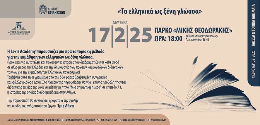 Μια πρωτοποριακή μέθοδο για την εκμάθηση των ελληνικών ως ξένη γλώσσα θα παρουσιάσει το Ελεύθερο Πανεπιστήμιο του Δήμου Βριλησσίων τη Δεύτερα 17/2/2025 στις 18:00 στην αίθουσα «Ν. Εγγονόπουλος» του πάρκου Μ. Θεοδωράκης (πρ. ΤΥΠΕΤ).