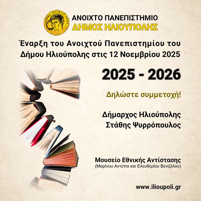 Ο Δήμος Ηλιούπολης βρίσκεται στην ευχάριστη θέση να ενημερώσει τους Δημότες και κατοίκους της πόλης ότι ο σημαντικός Θεσμός του Ανοιχτού Πανεπιστημίου επανέρχεται στην πόλη, πιστός "στο ραντεβού του με τους Δημότες με στόχο τη διά βίου μάθηση".