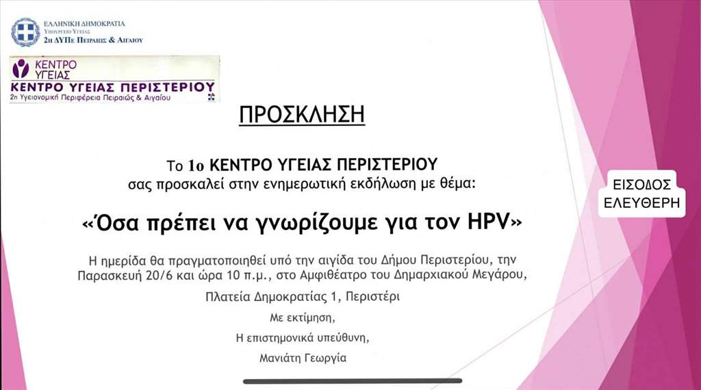 Το 1ο Κέντρο Υγείας Περιστερίου, υπό την αιγίδα του Δήμου Περιστερίου, διοργανώνει ενημερωτική ημερίδα με τίτλο: «Όσα πρέπει να γνωρίζουμε για τον HPV».