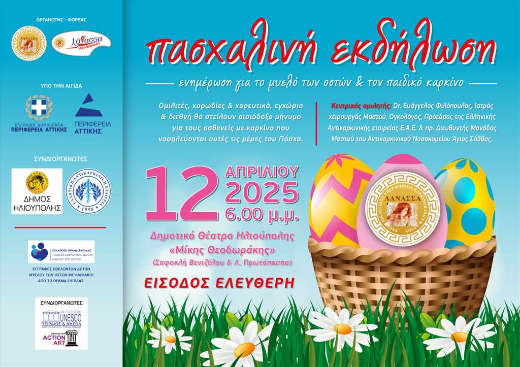 Το Ειδικό Φιλανθρωπικό Σωματείο ΛΑΝΑΣΣΑ υπέρ ΠΑΙΔΙΩΝ ΜΕ ΚΑΡΚΙΝΟ με την υποστήριξη του ΔΗΜΟΥ ΗΛΙΟΥΠΟΛΗΣ, την Ελληνική Αντικαρκινική Εταιρεία και την Unesco Pireus και islands & Ιnternational Action Art, έχει την τιμή να σας προσκαλέσει σε εκδήλωση υπέρ του παιδικού καρκίνου σε συνεργασία με το ΟΡΑΜΑ ΕΛΠΙΔΑ, στο Δημοτικό Θέατρο Ηλιούπολης «Μίκης Θεοδωράκης», στις 12 Απριλίου 2025 στις 18:00 μ.μ.