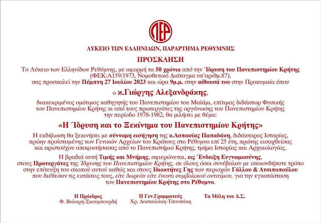 Το Λύκειο των Ελληνίδων Ρεθύμνης, εορτάζοντας τα 50 χρόνια (Χρυσό Ιωβηλαίο) του Πανεπιστημίου Κρήτης, σας προσκαλεί την 27η Ιουλίου ημέρα Πέμπτη και ώρα 9μ.μ. στην αίθουσά του στην Προκυμαία.