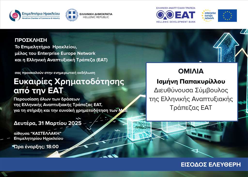 Το Επιμελητήριο Ηρακλείου, μέλος του Enterprise Europe Network, σε συνεργασία με την Ελληνική Αναπτυξιακή Τράπεζα (ΕΑΤ) διοργανώνει ενημερωτική εκδήλωση με θέμα «Ευκαιρίες χρηματοδότησης από την Ελληνική Αναπτυξιακή Τράπεζα».