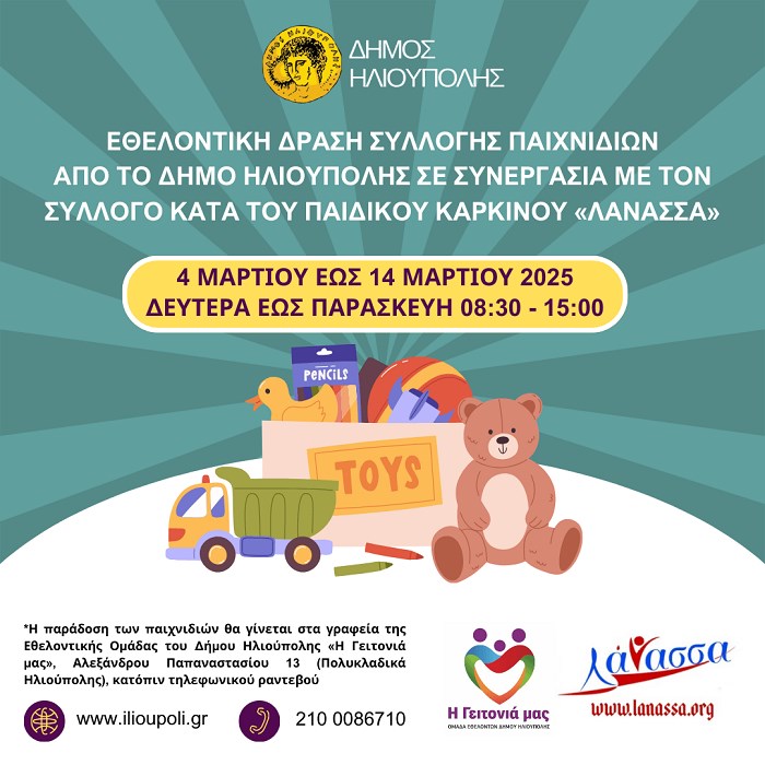 Η εθελοντική ομάδα «Η Γειτονιά μας» του Δήμου Ηλιούπολης, σε συνεργασία με το Πιστοποιημένο Ειδικό Φιλανθρωπικό Σωματείο Πρωτοβάθμιας Φροντίδας Ειδικού Σκοπού «Λάνασσα», διοργανώνουν εθελοντική δράση για τη συλλογή καινούριων και μεταχειρισμένων (σε άριστη κατάσταση) παιχνιδιών. Τα παιχνίδια που θα συγκεντρωθούν θα προσφερθούν στα παιδιά του Νοσοκομείου Παίδων και του Αγλαΐα Κυριακού, με σκοπό να τους χαρίσουμε χαμόγελα και να τους προσφέρουμε στήριξη σε μια δύσκολη περίοδο.