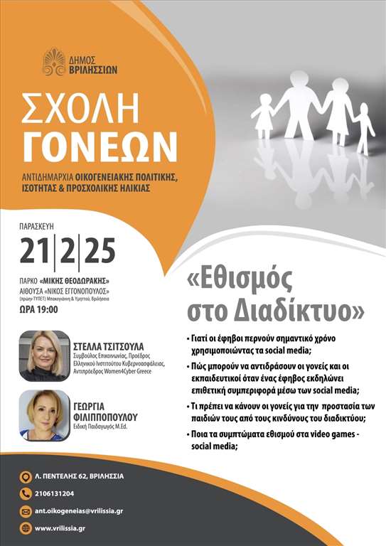 Αφιερωμένη στο ζήτημα του εθισμού των ανηλίκων στο διαδίκτυο είναι η προσεχής διάλεξη της Σχολής Γονέων του Δήμου Βριλησσίων που θα πραγματοποιηθεί την Παρασκευή 21/02 και ώρα 19:00 στην αίθουσα «Ν. Εγγονόπουλος» στο πάρκο Μ. Θεοδωράκης (πρ. ΤΥΠΕΤ).
