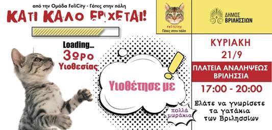 Tην προσεχή Κυριακή 21 Σεπτεμβρίου τα αδέσποτα γατάκια των Βριλησσίων περιμένουν στην πλατεία Αναλήψεως από τις 17:00 έως τις 20:00 να γνωρίσουν τις παντοτινές τους οικογένειες.