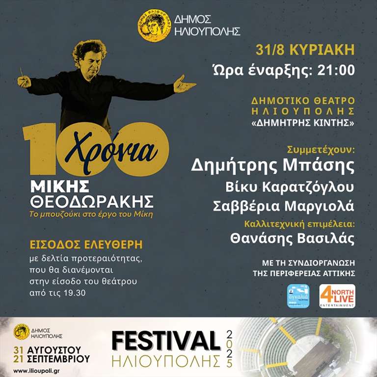 Ο Δήμος Ηλιούπολης έχει εξασφαλίσει ΕΛΕΥΘΕΡΗ ΕΙΣΟΔΟ στην έναρξη του Φεστιβάλ Ηλιούπολης 2025 στις 31 Αυγούστου 2025 με μία μοναδική συναυλία για τα 100 χρόνια «Μίκης Θεοδωράκης» από τους ερμηνευτές ΔΗΜΗΤΡΗ ΜΠΑΣΗ, Βίκυ Καρατζόγλου και Σαβέρια Μαργιολά.