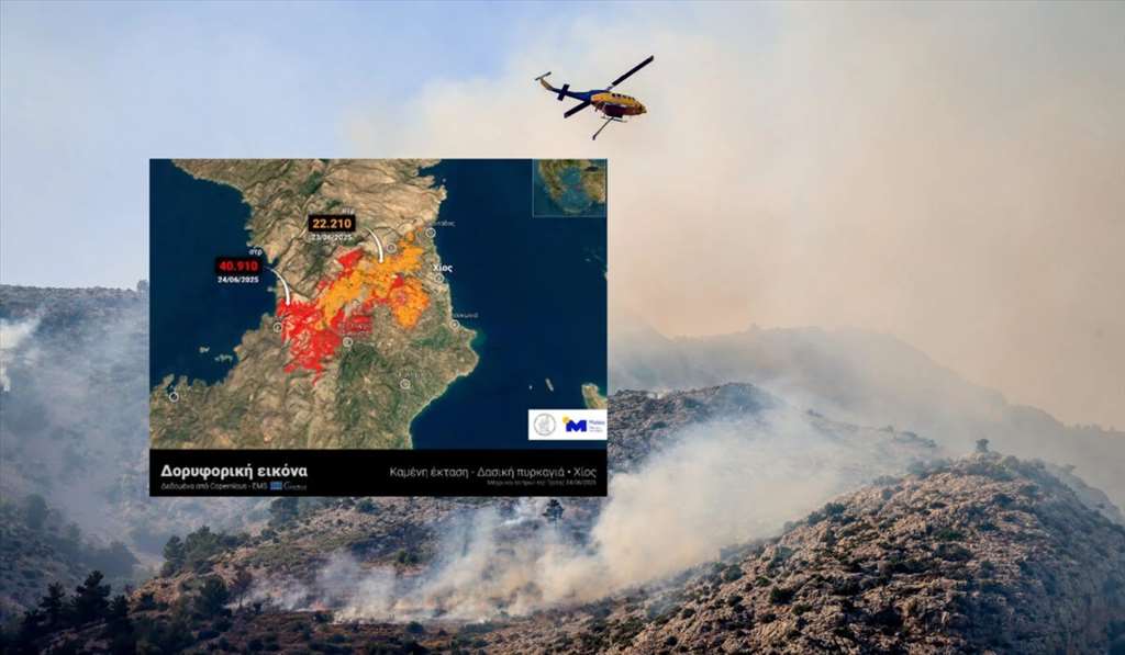 Όπως αναφέρουν ο Κ. Λαγουβάρδος και ο Γ. Κύρος από το Εθνικό Αστεροσκοπείο Αθηνών/meteo.gr, αξιοποιώντας στοιχεία της Υπηρεσίας Ταχείας Χαρτογράφησης Copernicus και του Ευρωπαϊκού Παρατηρητηρίου για Δασικές Πυρκαγιές (EFFIS), η καμένη έκταση στο νησί ανήλθε σε περίπου 22.210 στρέμματα έως το πρωί της Δευτέρας 23 Ιουνίου 2025, ενώ μόλις ένα 24ωρο αργότερα, την Τρίτη 24 Ιουνίου, η συνολική καταστροφή υπολογίστηκε στα 40.910 στρέμματα.